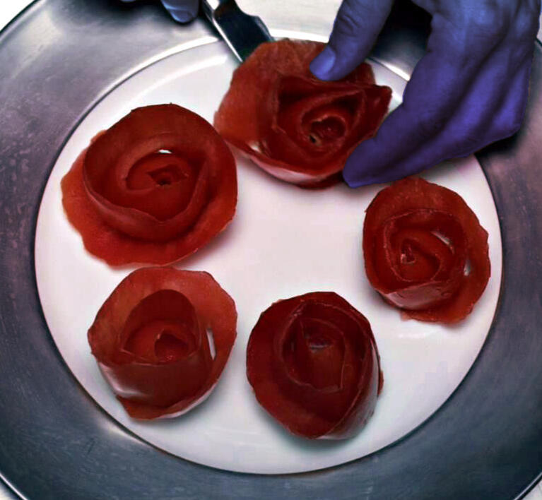 ❣ or ☠ Jellied Compote: Stewed and sugared fruit rendered firm with gelatin, then chilled and cut into bite-sized squares.